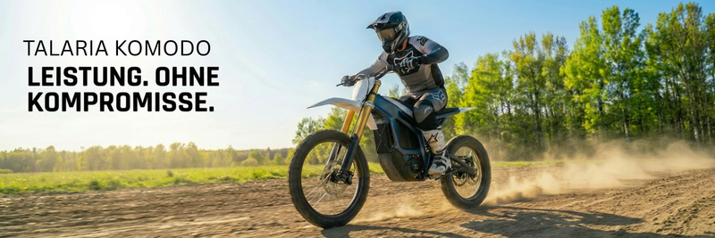 Die Talaria Komodo kommt vollkommen MX- und Enduro-ready direkt ab Werk – keine Umbauten, kein Nachrüsten. Mit bis zu 32 kW Peakleistung, 4,37 kWh Premium-Akku, geschmiedetem Aluminiumrahmen und vollwertigem 21/18-Zoll Offroad-Radsatz liefert sie maximale Performance auf jedem Terrain. Nur 98 kg Gesamtgewicht, moderne Geometrie und hochwertige Fahrwerkskomponenten machen die Komodo zu einem kompromisslosen Bike für anspruchsvolle Trails, steile Anstiege und intensiven Offroad-Einsatz – sofort fahrbereit, genau so wie sie ist.